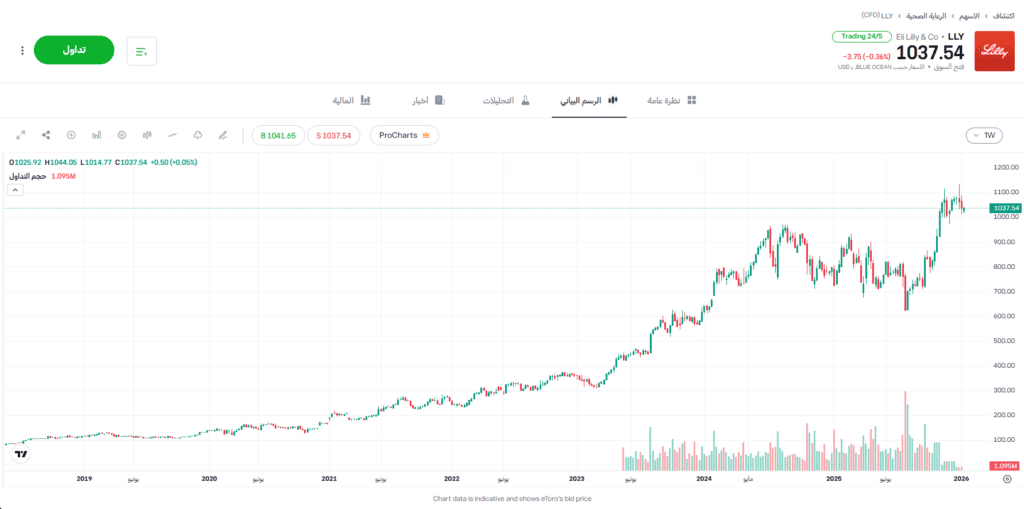- التقييم والسقف السوقي: بعد أن أصبحت مؤخرًا أول شركة أدوية تصل قيمتها السوقية إلى تريليون دولار، يستمر تداول سهم ليلي بعلاوة سعرية، رغم أنه لا يزال أقل من متوسط نسبة السعر إلى الأرباح (P/E) لـ 5 سنوات.