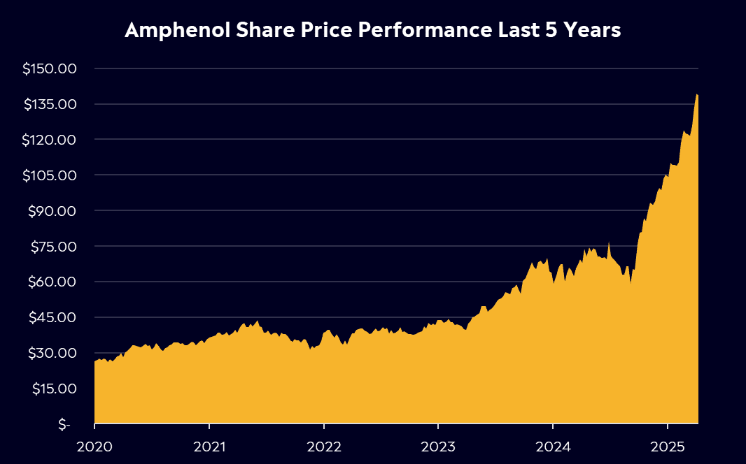 Amphenol may not be a standout name like Nvidia or Palantir, but it makes the connectors that make it all possible, quietly delivering huge returns for investors along the way. Shares are up 100% so far in 2025, recently hitting a record high of USD$142. It’s also a compounding beast having returned 26% average annualised returns in the last decade. The stock’s surge reflects not just the AI-driven data center buildout, but also a decade-plus of relentless execution.