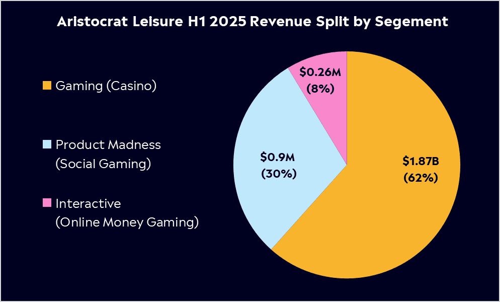 The company isn’t a one trick pony though. Beyond casino floors, Aristocrat has also become a force in digital gaming. It operates three business segments reflecting the businesses diversity. Aristocrat Gaming (land-based casino machines), Product Madness (social casino games), and Aristocrat Interactive (online real-money gaming). This unique mix of B2B casino products and direct-to-consumer games positions Aristocrat as a global entertainment powerhouse rather than a mere ‘pokie’ machine maker.