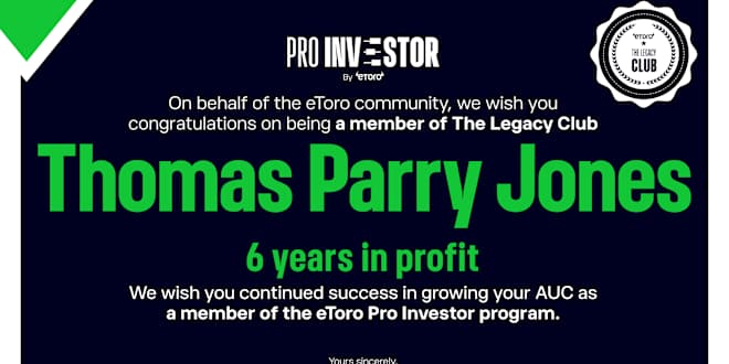 Subject: Popular Investor Program milestone Dear investors, As we finish the week a slightly different post, I have just completed my 6th year on the platform in profit, a huge milestone I’m very proud of as a Pro Investor ! Thanks, TJ Přeložit