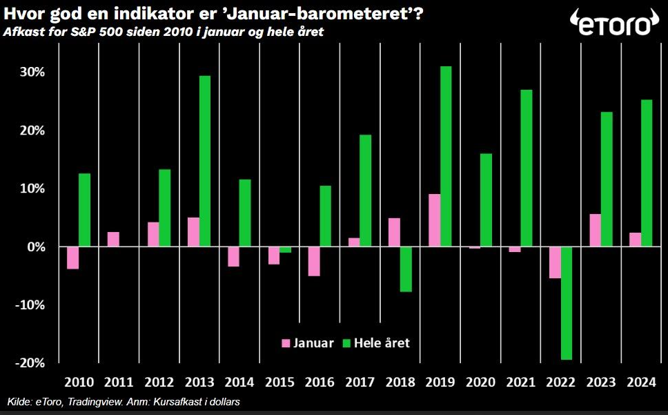 Måske – der findes i hvert fald en omdiskuteret markedsteori kaldet ’januar-barometeret’. Den siger, at hvordan S&P 500 klarer sig i januar, kan være en indikator for, hvordan hele året udvikler sig. Hvis januar oplever positivt momentum, siger teorien, at årets afkast vil ende i plus, mens en dårlig start i januar vil medføre, at året ender i rødt.