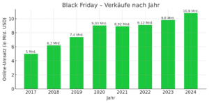 Im Jahr 2024 sorgte der Black Friday weltweit für Rekordumsätze. Insgesamt wurden 74,4 Milliarden US-Dollar ausgegeben – 5 Prozent mehr als im Vorjahr und mehr als doppelt so viel wie 2017. Das entspricht dem Elffachen der Marktkapitalisierung von Zalando und zeigt, welche enorme wirtschaftliche Kraft hinter diesem Tag steckt.