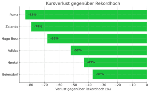Der Konsumsektor zählt derzeit zu den schwächsten Bereichen im deutschen Aktienmarkt. Besonders deutlich zeigt sich das an den Kursabständen zu den Rekordhochs. Puma und Zalando liegen rund 80 Prozent im Minus, Hugo Boss hat über zwei Drittel seines Wertes verloren, bei Adidas hat sich die Bewertung halbiert. Selbst die defensiveren Titel wie Henkel und Beiersdorf stehen noch rund 40 Prozent unter ihren Allzeithochs.