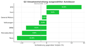 Während der durchschnittliche Umsatz der ausgewählten Autohersteller im zweiten Quartal im Jahresvergleich mit 2,2 Prozent im Minus liegt, sticht BYD mit einem kräftigen Plus von 14 Prozent hervor. Damit unterstreicht der chinesische Konzern seine starke Position im E-Mobility-Markt. Die meisten etablierten Autobauer mussten dagegen Rückgänge hinnehmen. Tesla (-11,8 %), Mercedes-Benz (-9,8 %), BMW (-8,2 %) sowie Volkswagen (-3,0 %) und General Motors (-1,8 %) verzeichneten schwächere Umsätze. Lediglich Ford konnte neben BYD mit einem Plus von 5 Prozent ein positives Ergebnis vorweisen.