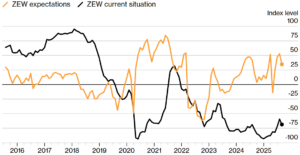Auch die Einschätzung der aktuellen Lage trübt sich erneut ein. Der ZEW-Index fällt von 68,6 auf 59,5 Punkte und bleibt damit klar unter den Erwartungen. Ein Blick zurück zeigt, dass der letzte positive Wert fast drei Jahre zurückliegt – im November 2021. Die Kluft zwischen Erwartung und Realität bleibt damit groß, sodass die Unsicherheit anhält. Das geht auch an den Anlegern nicht spurlos vorbei, sie reagieren auf die anhaltende Unsicherheit mit entsprechenden Erwartungen. 57 Prozent der Deutschen erwarten, dass der Goldpreis in den nächsten 6 bis 12 Monaten steigen wird. Das ist ein deutliches Signal für verstärkte Absicherung und eine vorsichtigere Haltung im Portfolio.