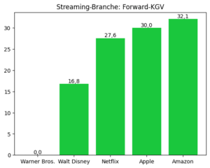 Apple (30,0) und Amazon (32,1) sind höher bewertet, tragen ihre Ergebnisse jedoch aus anderen Segmenten als dem Streaming-Geschäft. Beide sind daher nur eingeschränkt mit Netflix vergleichbar, da sie zusätzliche Ergebnisrisiken außerhalb des reinen Streaming-Modells haben.