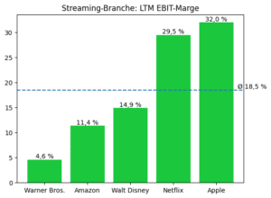 Nur Apple erreicht mit 32,0 Prozent eine noch höhere Marge, ist jedoch kein klassischer Streaming-Anbieter. Walt Disney (14,9 %) und Amazon (11,4 %) liegen deutlich darunter, während Warner Bros. (4,6 %) zeigt, wie schwierig nachhaltige Profitabilität im Streaming-Geschäft ist.