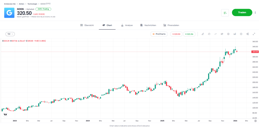 - Risikofaktoren: Zu den zentralen Risiken zählen kartellrechtliche Verfahren in den USA und Europa. Darüber hinaus besteht die Möglichkeit, dass KI-gestützte Suchergebnisse klassische Werbeformate teilweise verdrängen und damit bestehende Erlösquellen unter Druck geraten.
