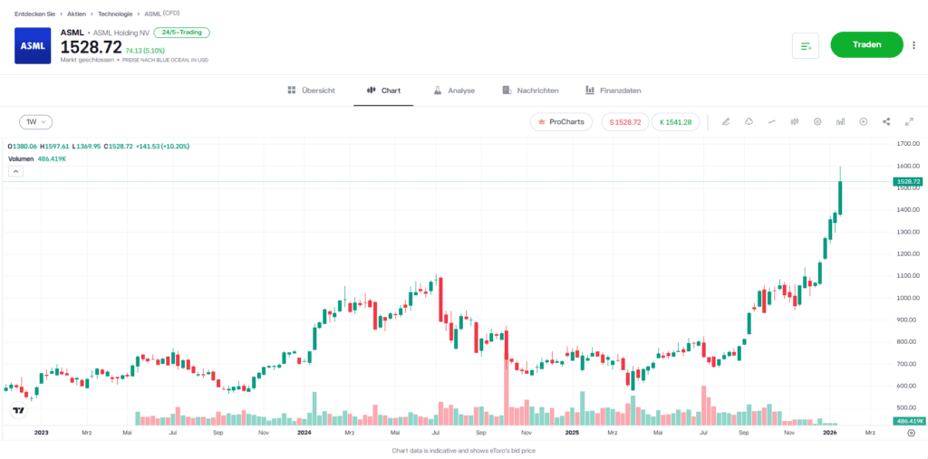 ASML Holding ist weltweit der einzige Hersteller von EUV-Lithografiesystemen, die für die Produktion modernster Halbleiter unverzichtbar sind. Diese Anlagen kosten je nach Ausführung rund 150 bis 350 Millionen Euro pro Einheit und bilden die technologische Grundlage für fortschrittliche Chipfertigung. ASML ist zudem das wertvollste Technologieunternehmen Europas und verfolgt eine kontinuierliche Kapitalrückführung über Aktienrückkäufe.