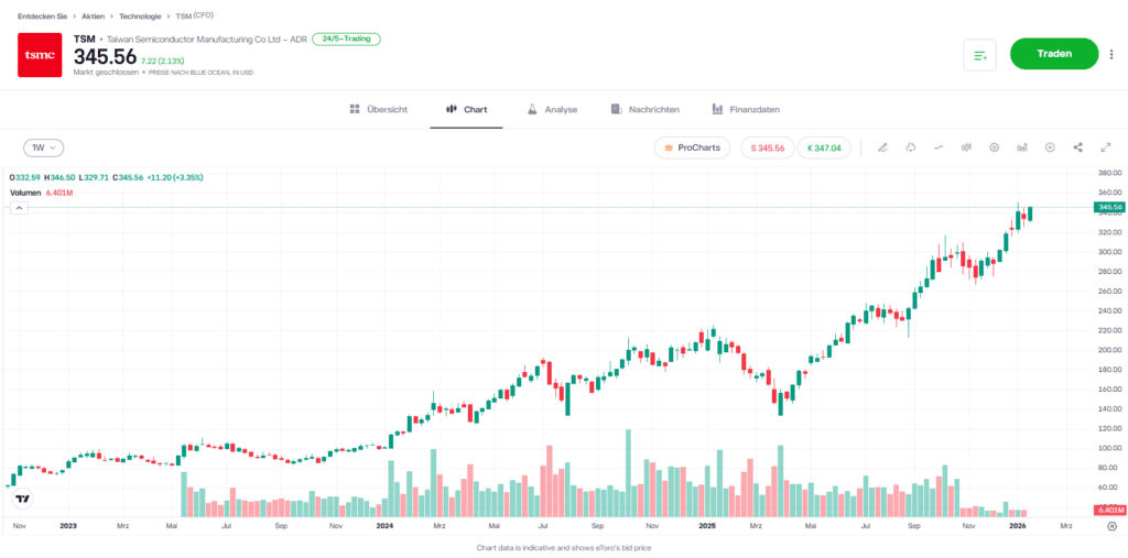 Taiwan Semiconductor Manufacturing Co. (TSMC) ist der weltweit führende Auftragsfertiger für hochentwickelte Halbleiter und produziert einen Großteil der modernsten Chips. Damit nimmt das Unternehmen eine zentrale Rolle innerhalb der globalen Halbleiter- und KI-Wertschöpfungskette ein.