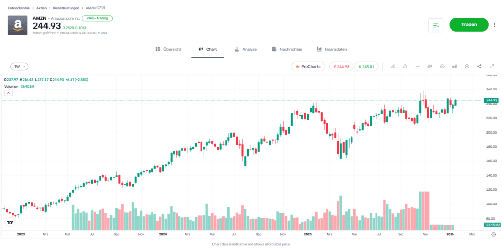 - Kursziele: Das mittlere Analysten-Kursziel für die Amazon-Aktie liegt bei etwa 297 US-Dollar. In besonders optimistischen Szenarien wird sogar ein Kursniveau von bis zu 340 US-Dollar bis Ende 2026 für möglich gehalten.