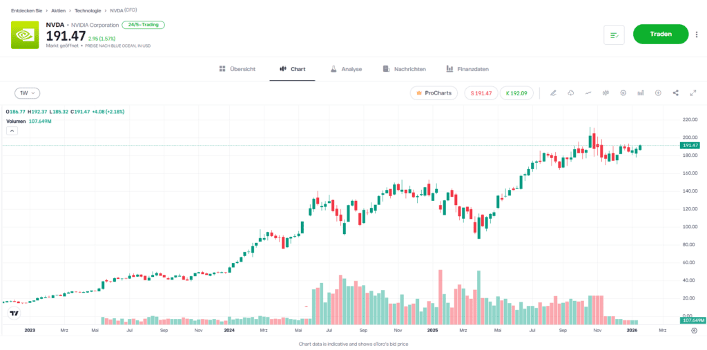 - Bewertung im Kontext des Wachstums: Trotz einer im Marktvergleich erhöhten Bewertung ist das Gewinnwachstum von Nvidia in den vergangenen Jahren stärker ausgefallen als erwartet. Im Jahr 2025 bewegte sich das PEG-Verhältnis zwischen 0,72 und 1,72 – eine Kennzahl, die für wachstumsorientierte Anleger eine wichtige Orientierung darstellt.