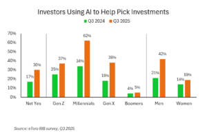October 1, 2025 – US retail investors are increasingly adopting AI tools to build their portfolios (58%), according to the latest quarterly Retail Investor Beat from trading and investing platform eToro. The research, which surveyed 1,000 American retail investors, revealed that 30% now use AI tools to pick or alter investments in their portfolios, up 75% in one year. The proportion of investors that are open to adopting these technologies dipped slightly to 28%, compared to 33% last year.