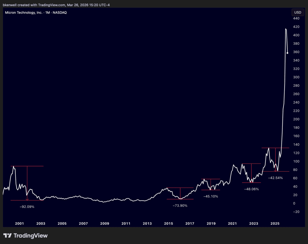 It comes back to Micron’s boom-and-bust cycles (highlighted in the stock price above). Wall Street has been reluctant to award the stock a premium valuation because of concerns around cyclicality and pricing pressure. Put another way, Micron has gone through periods where demand is enormous, supply is tight, and pricing power rises dramatically. But when demand cools or supply outpaces it, that pricing power can deteriorate just as quickly — boom, then bust.