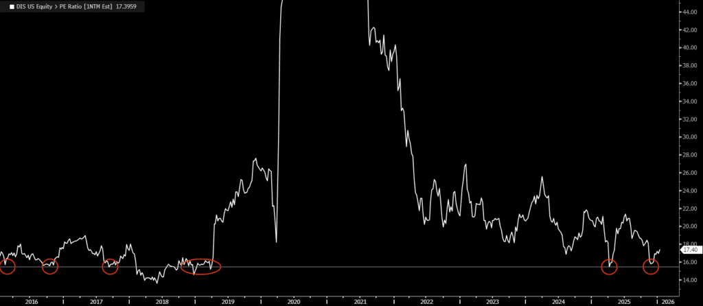 Disney’s forward P/E ratio. Source: Bloomberg, 1/12/2026