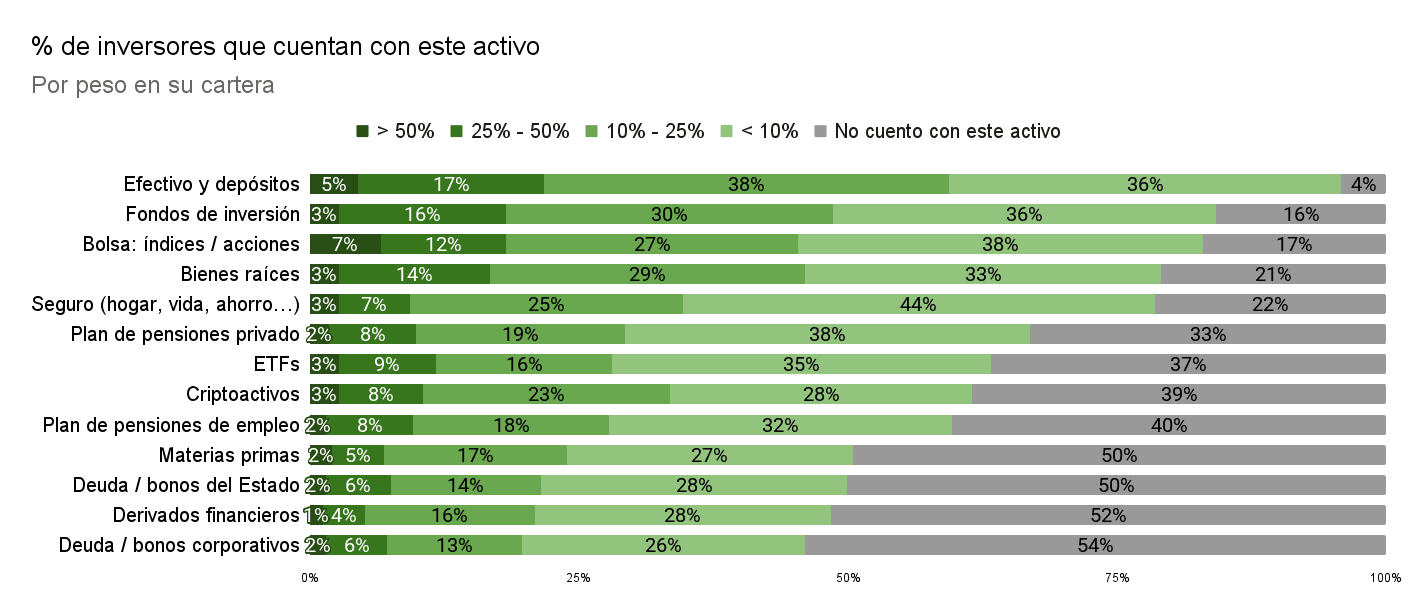 El 84% dispone de fondos de inversión en sus carteras, tres puntos por debajo de la cifra de 2023. Aunque para un 36% de ellos supone menos del 10% de sus activos financieros, para el 30% está entre el 10% y el 25% y para el 16% entre un 25% y un 50%.