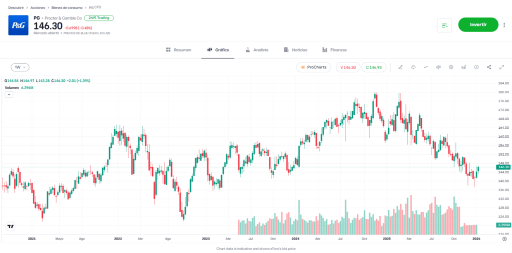 - Acción defensiva: P&G se considera como una acción defensiva que brinda estabilidad a la cartera en tiempos de volatilidad.