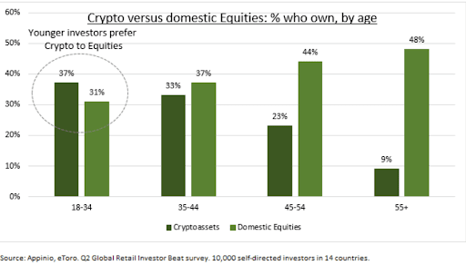 4) Selon notre enquête Retail Investor Beat du 2e trimestre, les jeunes de la tranche 18-34 ans, préfèrent les crypto-actifs aux actions (37% contre 31%), voir graphique ci-dessous.