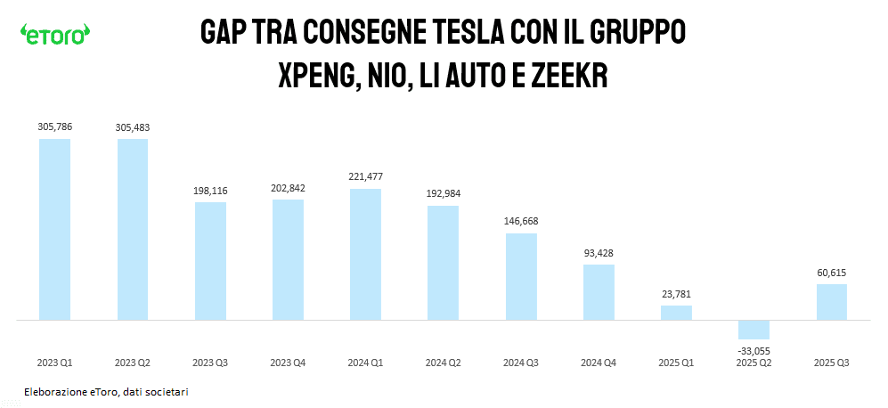 Il confronto diretto con Tesla, letto attraverso il grafico sul gap rispetto al gruppo XPeng, NIO, Li Auto e Zeekr, aiuta a rimettere le cose in proporzione. Nel secondo trimestre 2025 il gruppo cinese complessivo aveva superato Tesla di 33.055 unità, nel terzo trimestre, con l’effetto fiscale attivato in America e il destocking, Tesla torna sopra di 60.615. Non è un sorpasso risolutivo, è un elastico. Dice che Tesla resta in grado di fare massa critica su richiesta e che la pipeline cinese sa chiudere rapidamente i buchi di gamma e di prezzo quando le condizioni lo consentono. È la fotografia di una competizione ormai a tre poli: scala globale BEV, portafoglio multi-tecnologia NEV e velocità di esperienza d’uso.