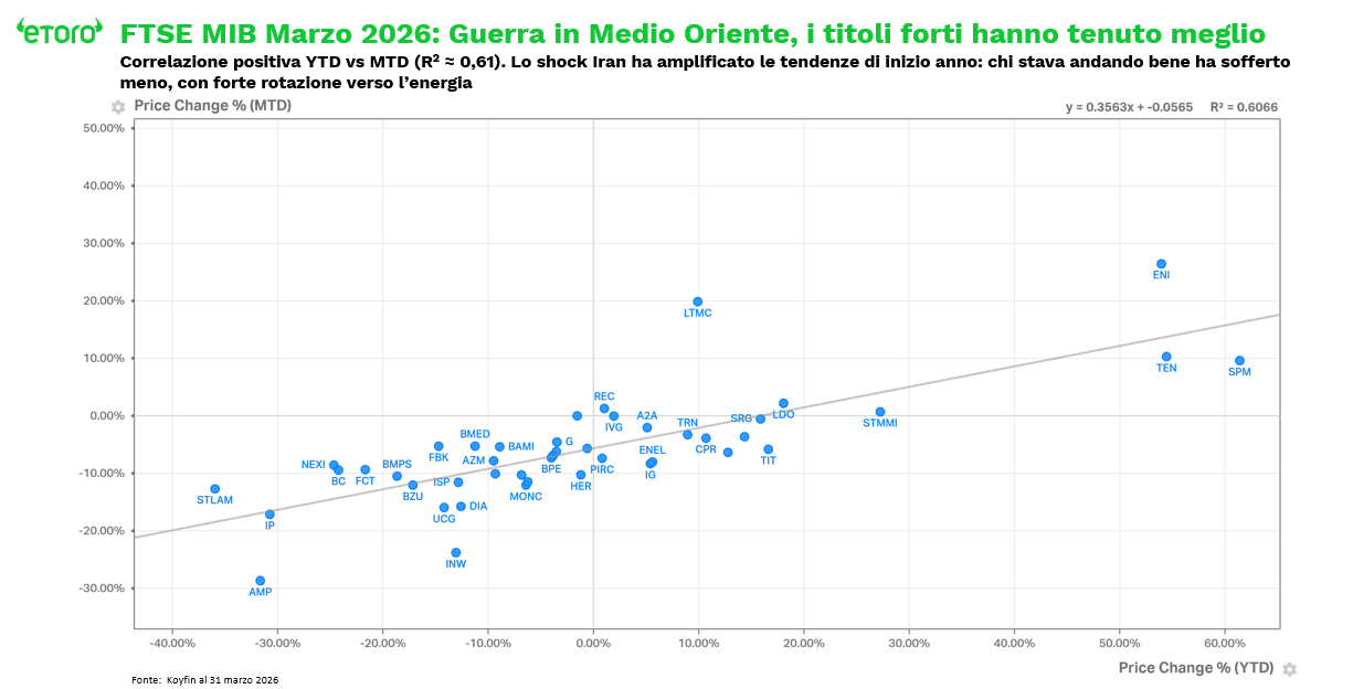 La correlazione positiva tra performance YTD e MTD (intero mese di marzo), con un R² intorno a 0,61, non va letta in modo meccanico. In assoluto non è un numero estremo, ma in un’analisi durante uno shock geopolitico è un dato molto significativo. Spiega oltre il 60% della varianza e racconta una cosa precisa: il mercato non ha ancora fatto un reset completo. Ha continuato a premiare, almeno in parte, i vincitori di inizio anno, con la grande eccezione del settore energetico che non ha semplicemente tenuto, ma ha imposto un cambio di narrazione. In altre parole, marzo non è stato il mese in cui tutto è stato rimesso in discussione. È stato il mese in cui una rotazione latente è diventata manifesta.