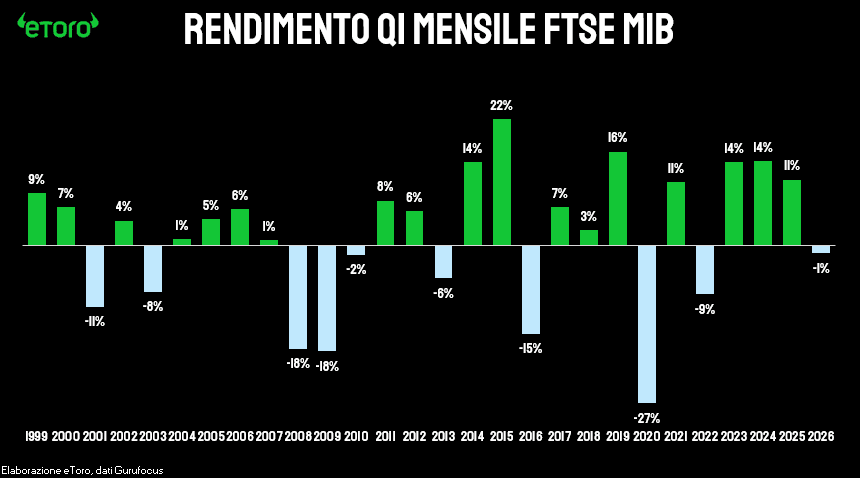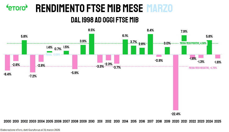 Il grafico dei rendimenti mensili del FTSE MIB dal 1998 ad oggi mette questo marzo in prospettiva storica: non è stato il peggior marzo di sempre, quel primato spetta al 2020 con -22,4%, ma è stato uno dei più violenti in un contesto di mercato già maturo, con una media storica dei mesi negativi intorno al -4,76% contro il +4,58% di quelli positivi.