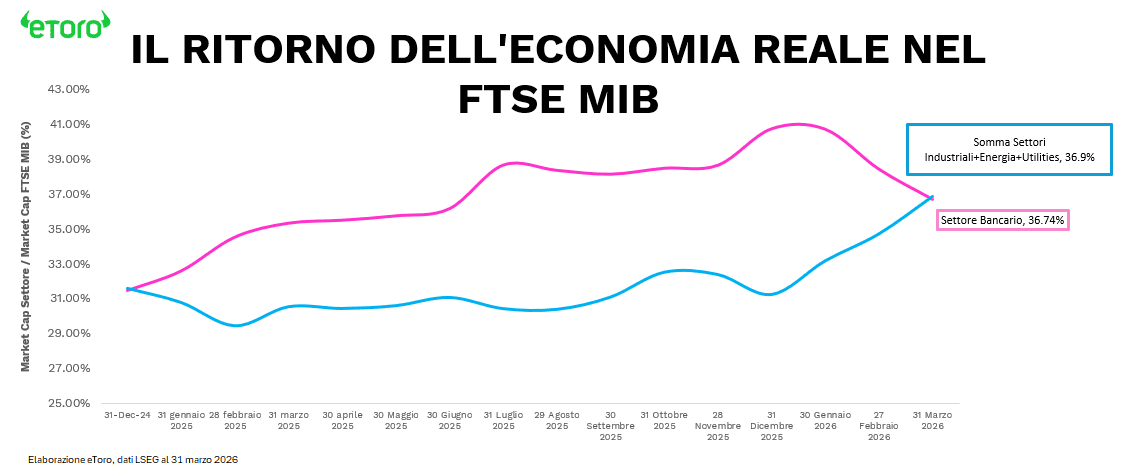 Il punto decisivo è proprio questo. L’energia a marzo non ha solo sovraperformato, ha cambiato la struttura dell’indice italiano. Il suo peso è salito all’11,72% (dal 9,81% di inizio mese), mentre il settore bancario è sceso al 36,74%, in netto arretramento rispetto al 40,78% di fine 2025. Per la prima volta da fine dicembre 2024, la somma di industriali, energia e utilities ha superato la capitalizzazione del comparto bancario. È un passaggio che merita di essere letto con attenzione, perché smonta uno dei presupposti impliciti con cui negli ultimi mesi si era osservato il FTSE MIB. Il mercato italiano non è più soltanto una macchina a leva bancaria. Sta tornando a essere anche una macchina industriale, energetica, infrastrutturale. L’uscita di BPSO dal paniere e l’ingresso di AVIO rafforzano simbolicamente questa traiettoria. Non è solo un cambio tecnico nel listino. È una fotografia che cambia prospettiva. Il peso della finanza arretra, quello dell’economia reale rialza la testa.