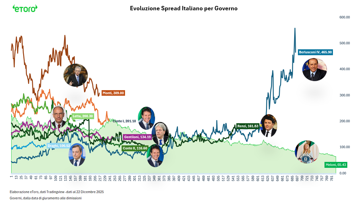 L’Italia, paradossalmente, non è stata il problema. Anzi. Il governo Meloni, terzo governo più longevo della storia italiana, partito da uno spread di 228 punti base, lo ha portato a 65 (al momento dell’analisi). Una riduzione di 162 punti, un risultato paragonabile solo a quello dell’era Monti. Una performance che mancava osservando i governi succedutisi da Berlusconi IV in poi.