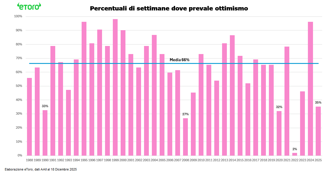 Prezzi e sondaggi non si parlano. Rally comprati, convinzione che non arriva. Il Bull-Bear Spread misurato dall’AAII è positivo solo nel 35% delle settimane (circa 18 occasioni su 52), contro una media storica del 66%. Peggio solo negli anni di crisi vera -1991 (recessione), il 2008 (finanziaria globale), il 2020 (pandemia) e il 2022 (inflazione post-Covid), riflettendo un sentiment eroso da incertezze macro e geopolitiche. È stato un mercato dove il pessimismo ha prevalso nei sondaggi, ma gli investitori retail hanno comunque comprato ogni correzione con entusiasmo “buy the dip”, mentre gli istituzionali rimanevano cauti, preferendo aspettare conferme macro.