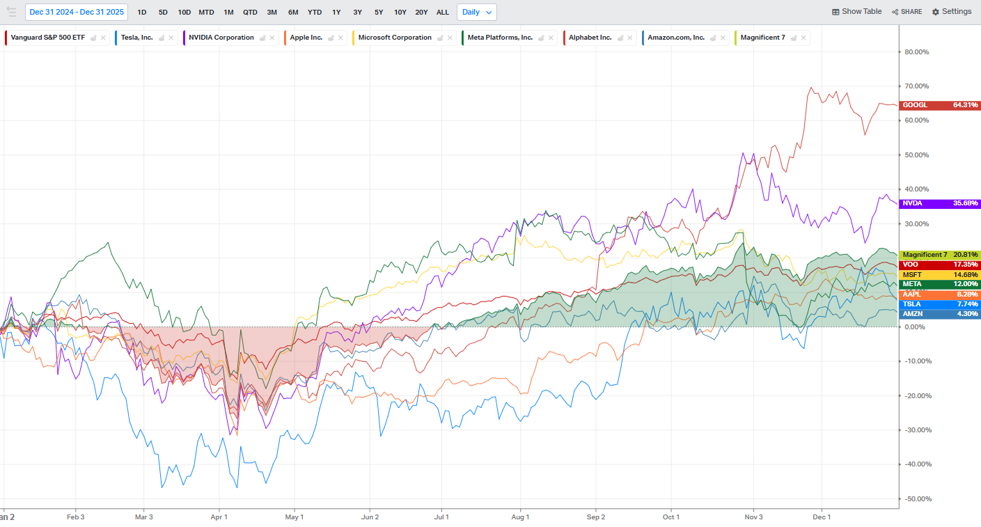 Le Magnifiche 7 chiudono complessivamente il 2025 con una performance di circa +21%, contro un +17% dell’S&P 500. Ma questa sovraperformance aggregata nasconde una frattura interna che segna un cambio di regime. Il gruppo smette di comportarsi come un blocco monolitico e diventa un insieme di traiettorie divergenti.