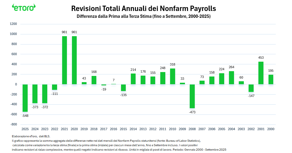 La somma aggregata delle revisioni tra la prima stima e la terza stima finale dei Nonfarm Payrolls, mese per mese, fino a settembre 2025, mostra una revisione complessiva fortemente negativa. Un aggiustamento che riporta il 2025 tra gli anni con le correzioni più ampie al ribasso dell’intera serie storica iniziata nel 2000.