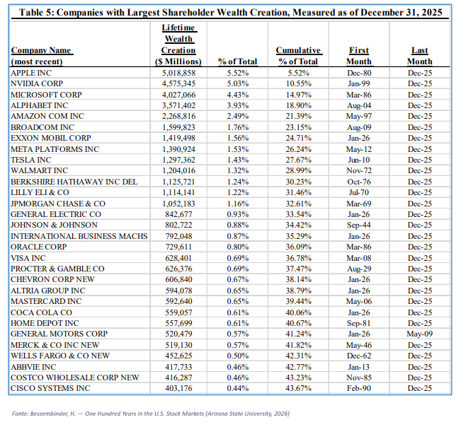 Ma non è solo un cambio di CEO. È il passaggio di una delle macchine di creazione di valore più potenti della storia moderna. Per capire il peso di questa eredità basta un numero. Dal 1926 al 2025, oltre 29.000 aziende hanno contribuito alla storia di Wall Street. Apple, da sola, ne ha generato 5,02 mila miliardi di dollari di ricchezza netta per gli azionisti (al netto dei Treasury bills). Il 5,52% dell’intero valore creato in un secolo. Un’azienda. Più del 5% di tutto. Nessun’altra azienda ha fatto meglio. E l’80% di questa ricchezza, circa 4,09 mila miliardi, è stata creata negli ultimi nove anni. Gli anni di Tim Cook.