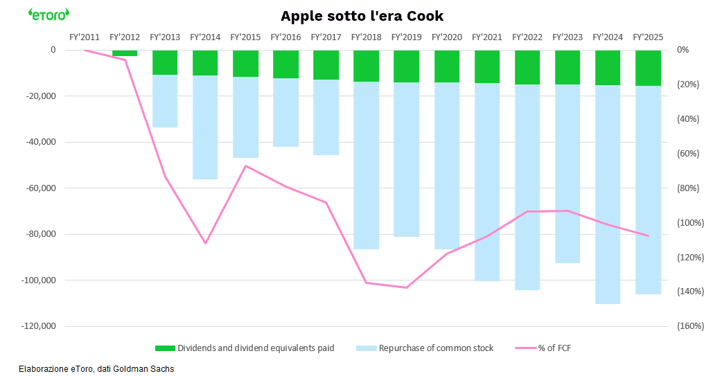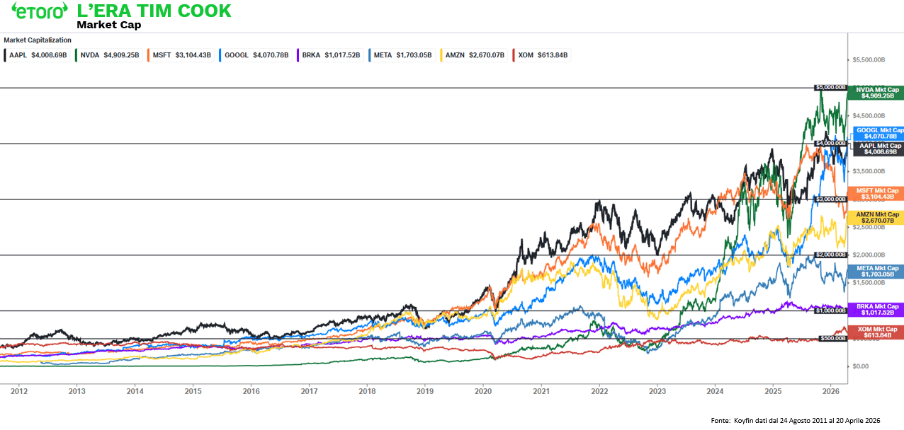 Nel frattempo, sotto la guida di Tim Cook, Apple ha segnato le tappe simboliche del mercato moderno. Prima azienda a superare la soglia dei 1.000 miliardi di capitalizzazione nel 2018, poi i 2 trilioni nel 2020 e i 3 trilioni nel 2023. Da un valore di circa 360 miliardi di dollari alla fine del 2011, sotto la sua cura è arrivata a valere oltre 4.000 miliardi (con i 4 e 5 trilioni passati invece a Nvidia, segnale che l’attenzione degli investitori si è spostata verso la nuova frontiera tecnologica). Apple è oggi (alla fine del primo trimestre 2026) la quarta azione più detenuta dai clienti eToro a livello globale, e la quinta in Italia: un segnale chiaro di quanto sia diventata un pilastro dei portafogli retail in tutto il mondo.