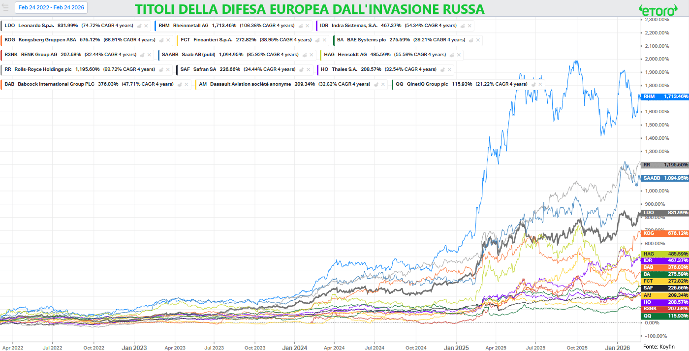 Quattro anni dall’invasione russa dell’Ucraina. Un anniversario che non resta confinato alla geopolitica. Da allora la difesa europea ha cambiato priorità, ritmo, dimensione. E Leonardo è stato uno dei titoli che più chiaramente hanno intercettato questo cambio di paradigma. Dal 2021 al 2025 il titolo è salito per cinque anni consecutivi.