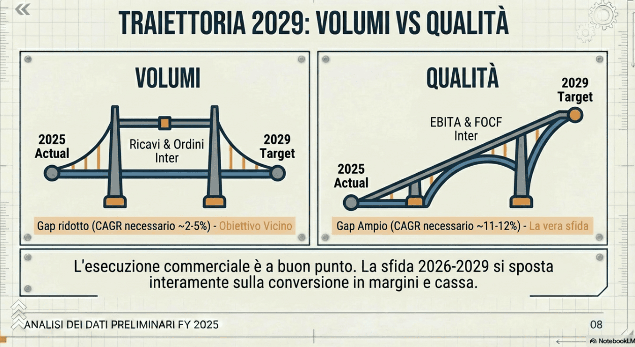 Partendo dai preliminari 2025, il target 2029 appare meno lontano sul fronte dei volumi, e più impegnativo sul fronte della qualità. I ricavi 2025 sono 19,5 miliardi e l’obiettivo 2029 è 24,0 miliardi. Significa un CAGR di circa 5,3% annuo, più contenuto rispetto a quello implicito nel piano quando il 2025 base era stimato a 18,6 miliardi, circa 6,6% annuo. Anche sugli ordini la distanza si accorcia: da 23,8 a 26,2 miliardi, un CAGR di circa 2,4%. La vera pressione resta su EBITA e cassa. Da 1,752 a 2,83 miliardi di EBITA, il CAGR richiesto è circa 12,7%. Da 1,011 a 1,53 miliardi di FOCF, circa 10,9%. In altre parole, la crescita dei volumi è sempre più una questione di esecuzione commerciale e backlog. La creazione di valore è una questione di margini, conversione in cassa e normalizzazione definitiva delle aree che ancora trascinano.