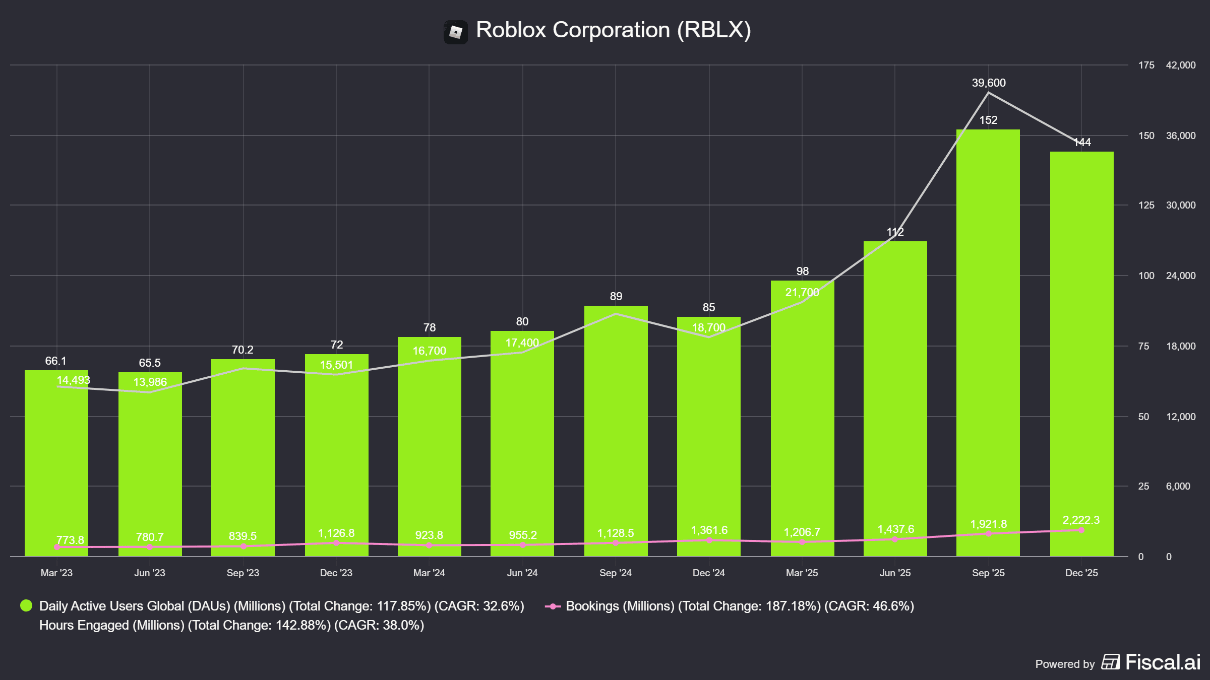 In questo contesto emerge un paradosso. Il vincitore non è un metaverso crypto, ma una piattaforma che non ha mai avuto bisogno della blockchain per esistere. Roblox ha chiuso il 2025 con 4,9 miliardi di dollari di ricavi, 6,8 miliardi di bookings e una media di 126 milioni di utenti attivi giornalieri, con picchi oltre i 150 milioni. Le ore di engagement hanno superato i 120 miliardi nell’anno. La capitalizzazione si aggira intorno ai 45 miliardi di dollari, circa 200 volte la market cap combinata dei principali token metaverso.