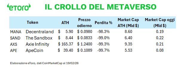 Oggi l’intera categoria “Metaverse” pesa circa lo 0,17% del mercato crypto (dati CoinMarketCap), con una capitalizzazione complessiva di circa 3,8 miliardi. Nel 2021 si parlava di nuova asset class, di pilastro del Web3, di rivoluzione immobiliare digitale. Nel 2026 è un segmento marginale.
