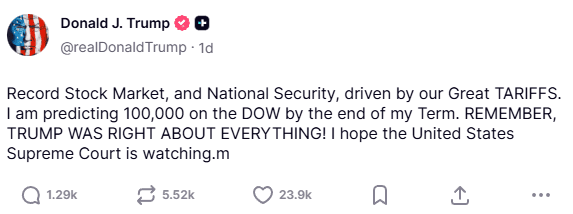 In questo contesto si inserisce anche il post pubblicato da Trump nel fine settimana, con la previsione di un Dow a 100.000 entro la fine del suo mandato. Non è una novità, e non va trattata come tale. Abbiamo già visto target politici trasformarsi in slogan di mercato, come il KOSPI a 5.000 in Corea del Sud. Ma c’è una differenza sostanziale. Un conto è Seul, un conto è la Casa Bianca, con tutto il carico di attenzione, aspettative e critiche che ne derivano.
