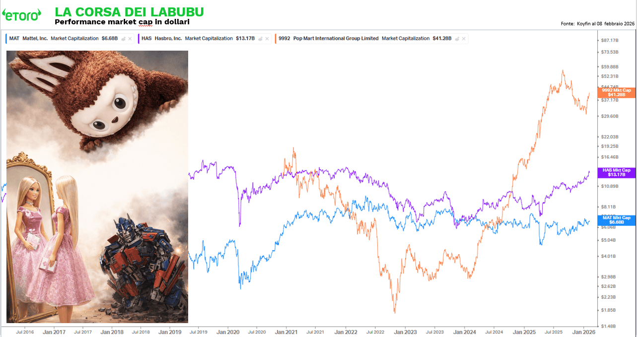 Infine, c’è un appuntamento che sembra leggero ma non lo è. Nel weekend parte il New York Toy Fair, con Hasbro e Mattel sotto i riflettori. Qui non si tratta solo di giocattoli, si tratta di IP, licensing, e della battaglia per monetizzare l’attenzione in un mondo dove i brand vengono doppiati in market cap da fenomeni culturali (si legga Labubu, con Pop Mart) che nascono e scalano in mesi. Se il mercato oggi premia la “difendibilità”, anche Barbie e Transformers devono dimostrare che la difendibilità non è nostalgia, è capacità di rinnovare domanda e margini.