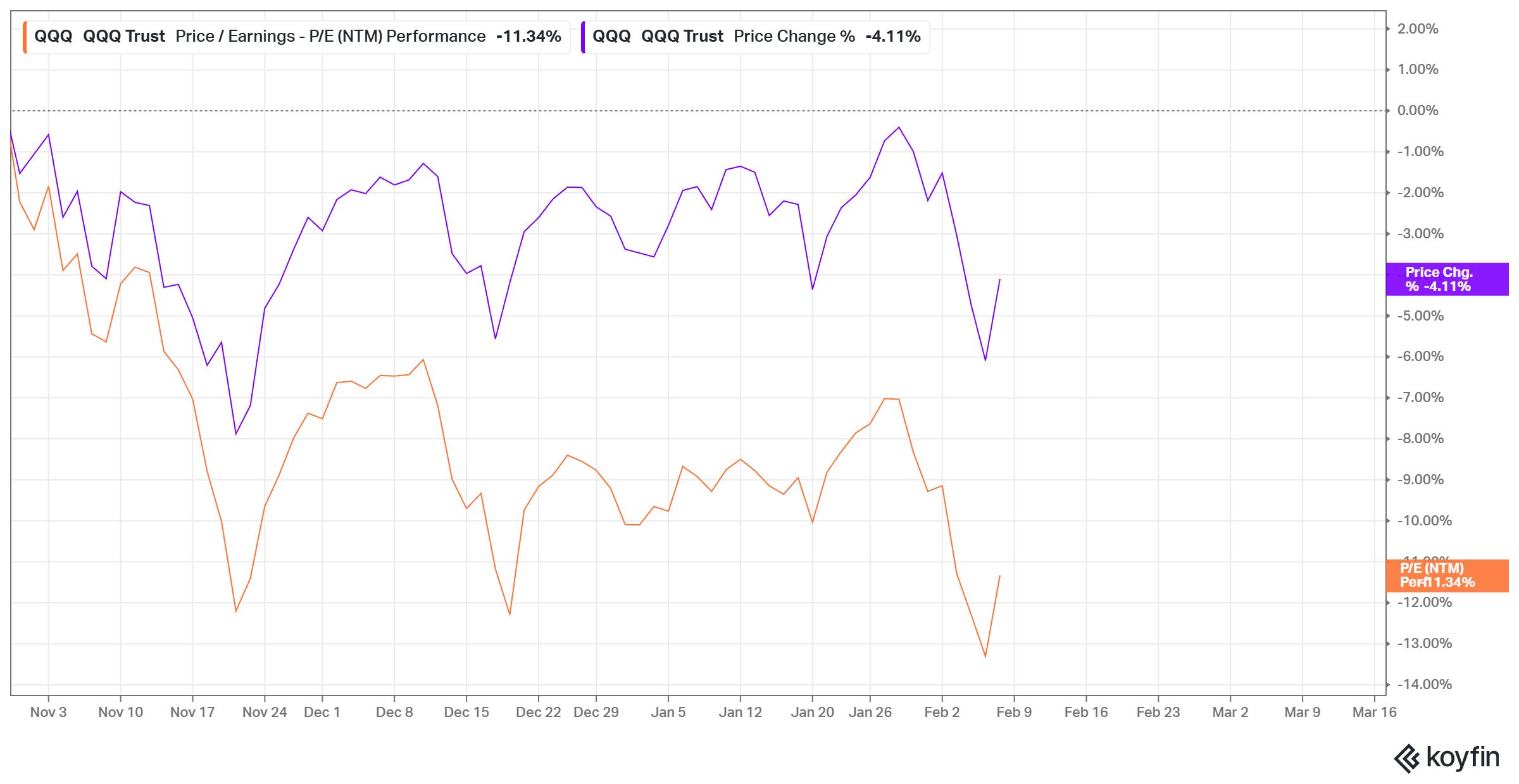 I grafici lo rendono più evidente delle parole. Dai massimi recenti il Nasdaq 100, qui misurato dall’ETF QQQ, perde circa il 4%, ma nello stesso periodo il multiplo P/E NTM si comprime di oltre l’11%. Questa divergenza è il punto centrale di tutta la lettura. Se fossimo di fronte a una correzione classica, sarebbe stato il prezzo a fare il lavoro sporco, trascinando con sé il multiplo. Qui succede l’opposto. Il prezzo corregge in modo relativamente ordinato, mentre è il multiplo a essere tagliato con decisione. Non è una fuga dal mercato, è una riscrittura del prezzo del futuro.