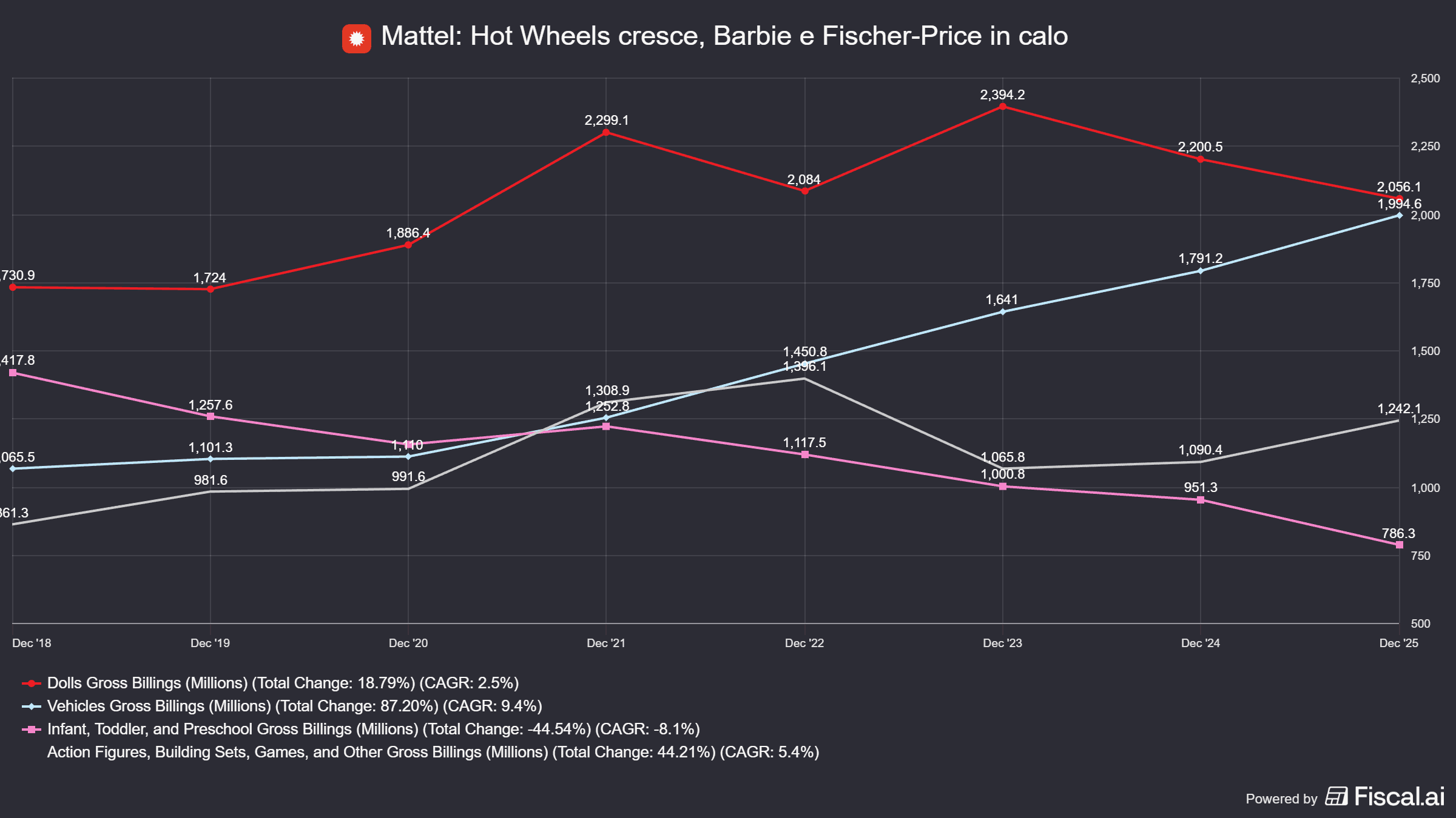 L’analisi per categoria di prodotto rivela la vera mappa del potere (e della fragilità) di Mattel. Hot Wheels è la storia di successo incontestabile: i gross billings del segmento Vehicles hanno raggiunto $1.995 milioni nel FY2025, in crescita dell’11%, con il brand Hot Wheels a $1.750 milioni. È il brand più grande del portafoglio, e quello che cresce di più. È il motore. Ma il problema è che il motore deve trascinare un carico sempre più pesante. Barbie, il brand iconico, ha visto i propri gross billings scendere a $1.204 milioni, un crollo dell’11% (-12% a cambi costanti). Nel Q2 2025, il segmento Dolls era sceso del 19%, con il management che attribuiva la causa a “fewer new Barbie product launches”. Fisher-Price ha perso anch’esso l’11%, scendendo a $622 milioni. Il segmento Infant, Toddler e Preschool nel suo complesso è crollato del 17%. L’unico altro punto luminoso sono le Action Figures (+14%), trascinate dalle uscite cinematografiche legate a Minecraft e Jurassic World. Ma questo tipo di crescita è per definizione volatile: dipende dal calendario delle release di Hollywood, non da una forza intrinseca del brand.