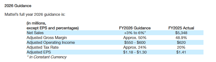 E arriviamo ora alla guidance 2026, che è forse (il condizionale è sempre d’obbligo nel mestiere) motivo per cui il mercato ha reagito con una violenza così brutale. Mattel prevede ricavi in crescita del 3-6% a cambi costanti, un adjusted gross margin di circa il 50% (in recupero), ma un adjusted operating income tra $550 e $600 milioni, in calo rispetto ai $620 milioni del 2025, e un adjusted EPS di $1,18-$1,30, ovvero fino al 16% in meno rispetto all’$1,41 dell’anno appena chiuso.