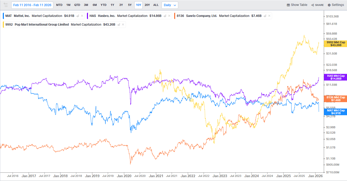 Il punto non è celebrativo. È strutturale. Dieci anni fa Mattel valeva circa 11 miliardi di dollari. Era il leader indiscusso del settore. Hasbro capitalizzava intorno ai 9,2 miliardi. Il primato non era solo operativo, era percezione di leadership. Poi è arrivato il sorpasso. Hasbro ha superato Mattel. Il grafico degli ultimi dieci anni è eloquente. Oggi Mattel capitalizza 4,91 miliardi. Pop Mart vale 43,26 miliardi. Questo significa che Pop Mart vale circa 8,8 volte Mattel.