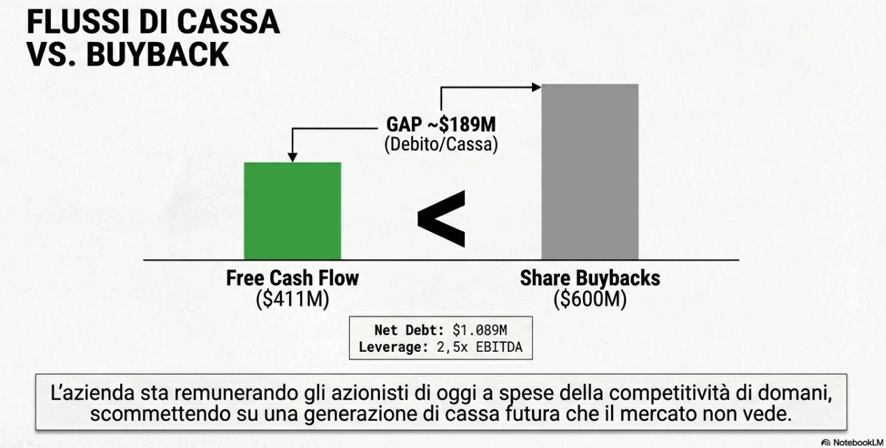 Ora, il buyback è uno strumento legittimo e spesso efficace di restituzione di valore agli azionisti. Ha ridotto le azioni in circolazione del 18% in tre anni, e questo ha un effetto meccanico positivo sull’EPS. Ma quando un’azienda con FCF in calo accelera i riacquisti, finanziandoli parzialmente con la cassa accumulata, sta facendo una scommessa implicita: che il business genererà più cassa in futuro. Se quella scommessa non si materializza, il buyback diventa un boomerang: hai speso soldi che avresti potuto investire, per comprare azioni che poi perdono valore.