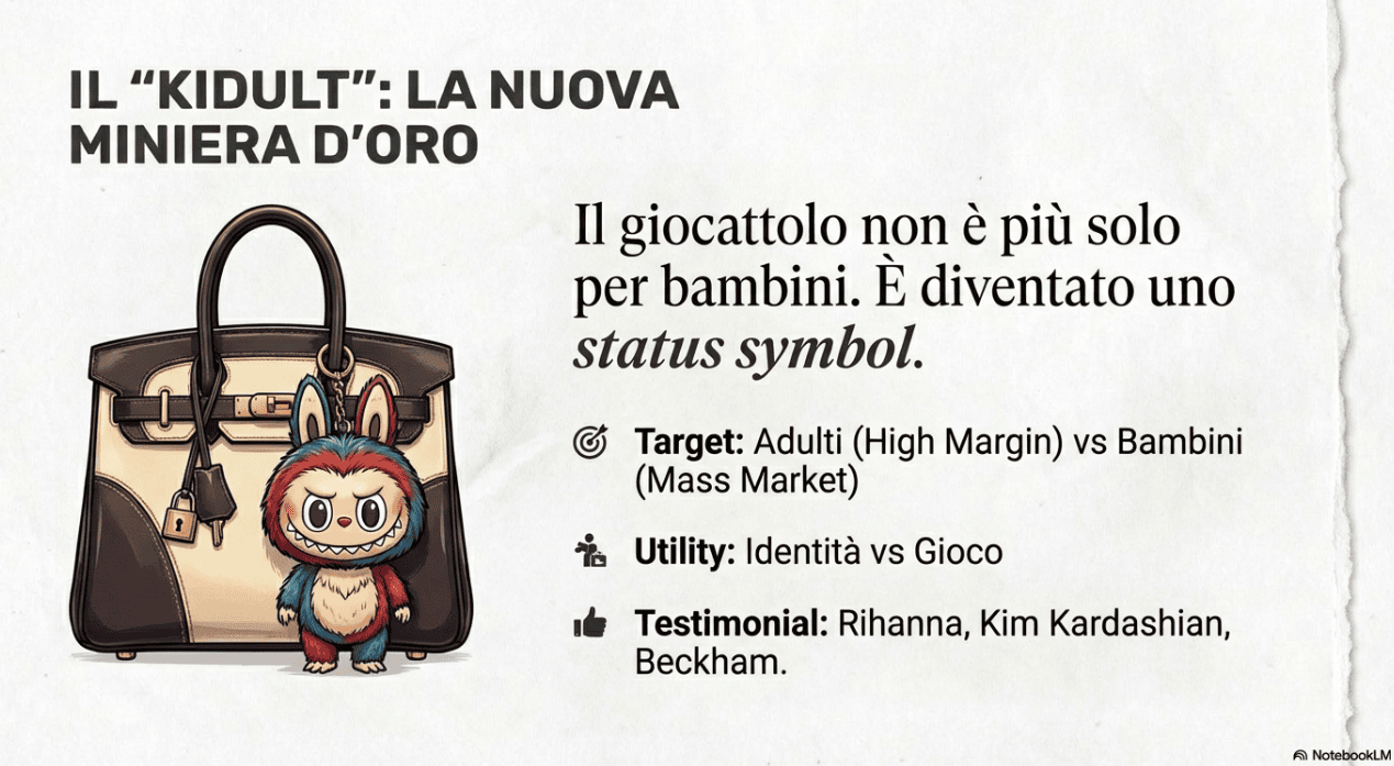 Secondo: Che il vero fenomeno sia il “kidult”. Il segmento degli adulti che comprano giocattoli per sé stessi, non per bambini. Pop Mart ha costruito il suo impero esattamente su questo segmento, trasformando il giocattolo da oggetto per bambini a status symbol, accessorio di moda, elemento identitario. Le Labubu attaccate alle borse di Rihanna, Kim Kardashian e David Beckham non sono giocattoli: sono segnali culturali, nel senso più pieno del termine.
