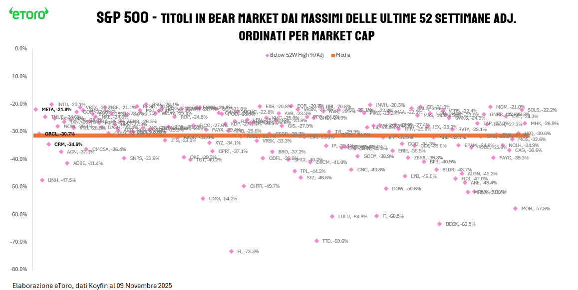 La scintilla di questa settimana è arrivata dalle valutazioni. Dopo sette mesi consecutivi di rialzi nel Nasdaq 100, l’entusiasmo per l’intelligenza artificiale si è scontrato con la realtà dei multipli. Non un crollo, ma una pausa fisiologica, una presa di profitto dopo l’euforia. L’AI resta una storia strutturale, ma nessuna narrativa è immune da brevi momenti di realismo. Dentro lo S&P 500, 157 titoli risultano oggi in bear market, con perdite superiori al 20% dai massimi adj. delle ultime 52 settimane. Tra questi figurano nomi come Meta e Oracle, ma la loro capitalizzazione complessiva rappresenta solo il 15% dell’indice, mentre le prime dieci società pesano per il 41%. I ribassi ci sono, ma non nei motori principali del mercato.