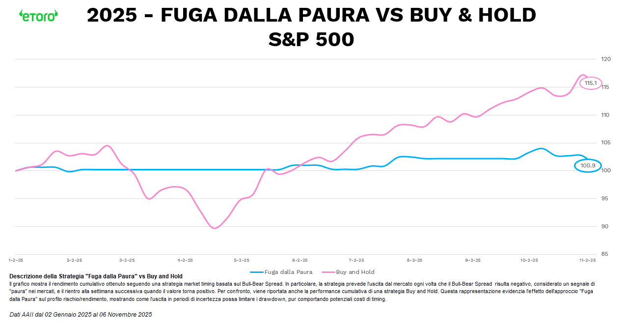 Il punto, forse, non è la correzione ma la psicologia che la circonda. Nel 2025 il sondaggio AAII mostra un Bull-Bear Spread negativo per il 67% del tempo, un’inversione rispetto al 2024, quando l’ottimismo aveva dominato per il 96% dell’anno. È come se più il mercato sale, più gli investitori smettano di credergli. La strategia “Fuga dalla Paura”, che esce dal mercato nei momenti di pessimismo e rientra solo quando il sentiment torna positivo, ha reso appena lo 0,9% da inizio anno, contro il +15% del semplice Buy and Hold. La differenza tra paura e pazienza, tra reagire e restare.
