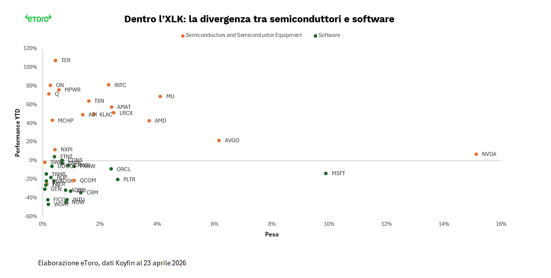 E non è un episodio isolato. È la sintesi di quello che sta succedendo da inizio anno. I semiconduttori hanno contribuito per oltre 1000 basis point alla performance del settore, mentre il software ne ha sottratti più di 650. Il risultato è un XLK comunque positivo, +8.38%, ma costruito su una divergenza sempre più ampia. Due storie diverse sotto lo stesso tetto.