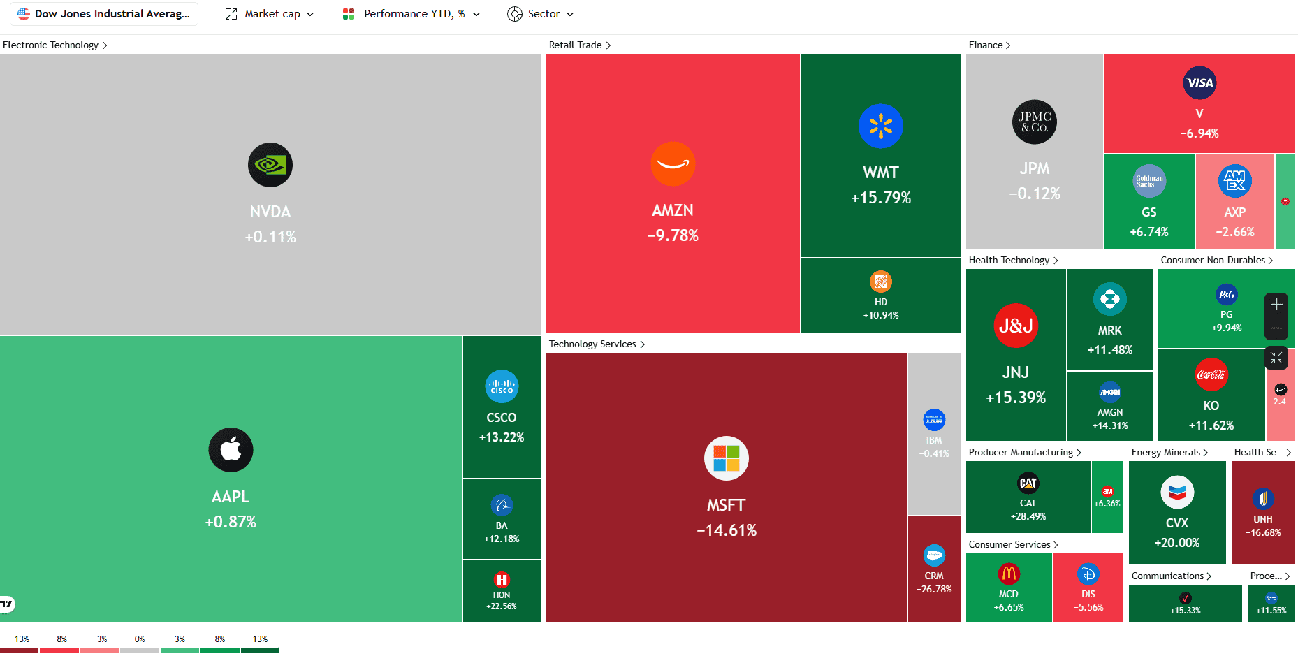 I primi cinque contributor, Caterpillar, Goldman Sachs, Amgen, Honeywell e Home Depot, sommano circa 464 punti base di contributo, oltre il 107% del ritorno netto dell’indice. Caterpillar domina con un +29,85% YTD che genera da sola +214 bp, quasi metà del rally complessivo. Seguono Goldman Sachs con +81,6 bp, Amgen con +63,6 bp, Honeywell con +57 bp e Home Depot con +47,9 bp. Da soli spiegano l’intera performance, compensando ampiamente i detrattori come Salesforce, Microsoft e UnitedHealth.