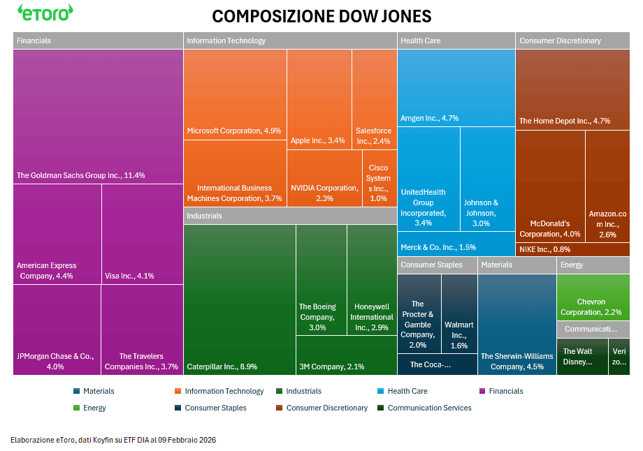 Non a caso, al 9 febbraio 2026 la performance YTD del Dow Jones Industrial Average si attesta a +4,33%. Un progresso apparentemente solido, anche perché 23 titoli su 30 sono in rialzo. Ma in un indice price-weighted il movimento non è mai davvero corale. È concentrato.