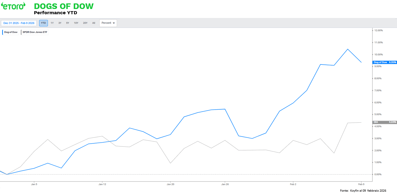 In questo contesto si inserisce la strategia Dogs of the Dow, che nel 2026 sta registrando una performance YTD del 9,35%, nettamente superiore al +4,33% del Dow. Il paniere, composto da Verizon, Chevron, Johnson&Johnson, Amgen, Merck, Coca-Cola, Home Depot, Procter&Gamble, Nike e UnitedHealth, replica uno schema già visto in fasi storiche di rotazione value come il 2016 o il 2022.